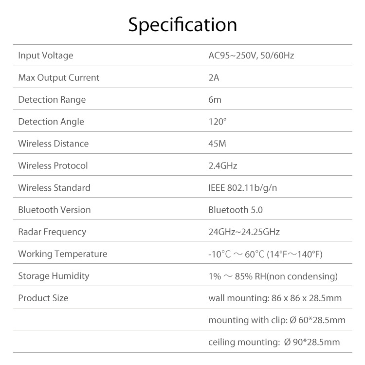 Smart Human Presence Detector:the human presence sensor adopts millimeter wave radar,sensing human movement and static presence.It can detect the tiniest movement,even breathing and heatbeat.