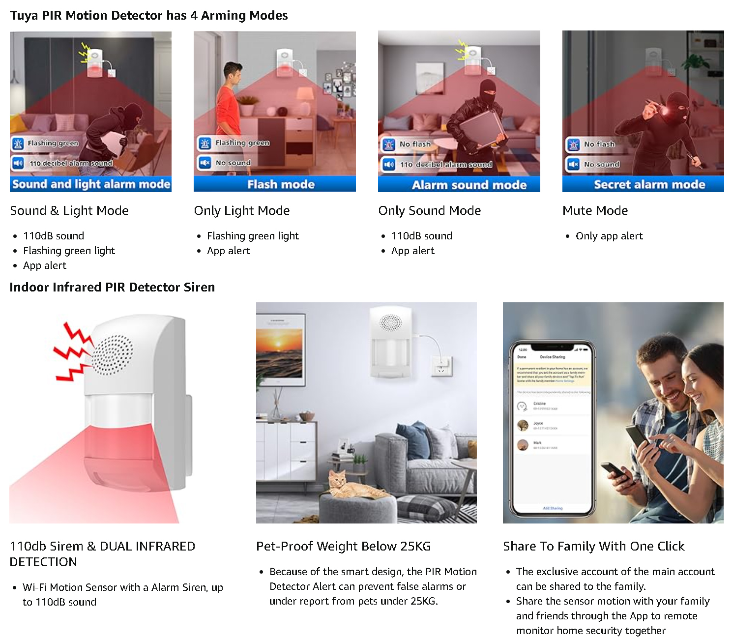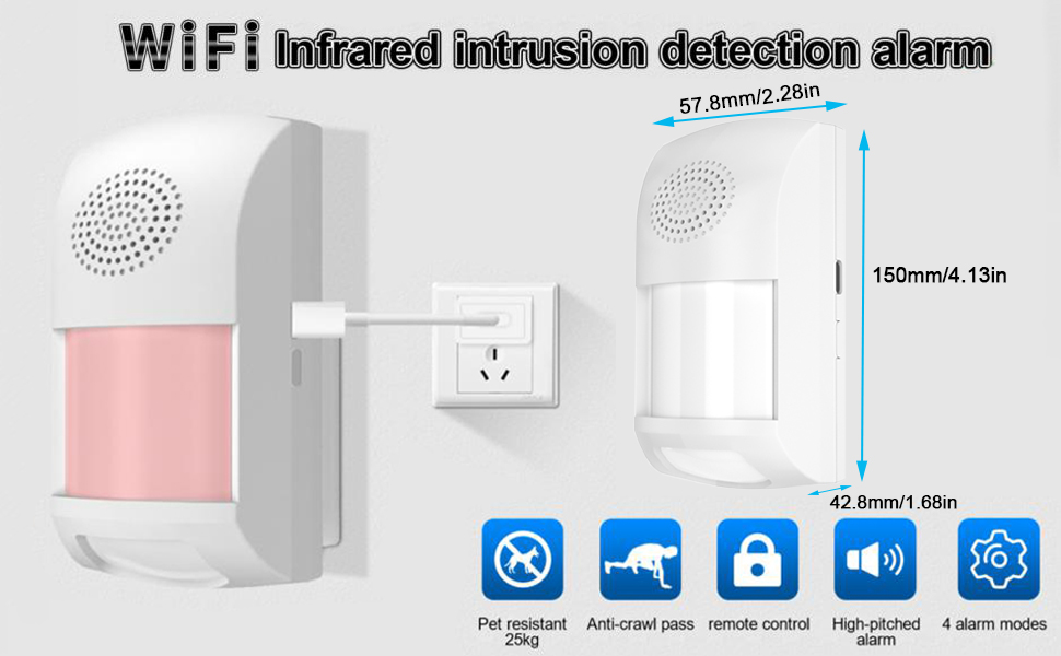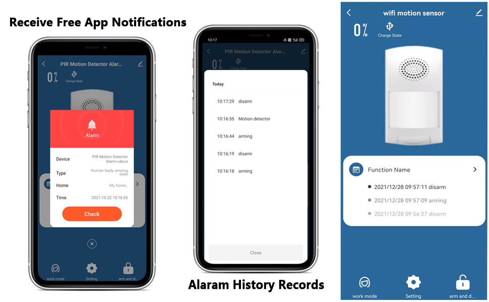The PIR MOTION DETECTOR WITH 4 ARMING MODES: You will like the flexibility in the alarm modes (①Sound & Light Mode ②Silent Mode ③Matte Mode ④Secret Mode). You can even set up a “secret mode” to alert you that motion has been detected without actually sounding the alarm itself, just sending out the push notification with an alarm sounding on the phone app so you don’t miss it.