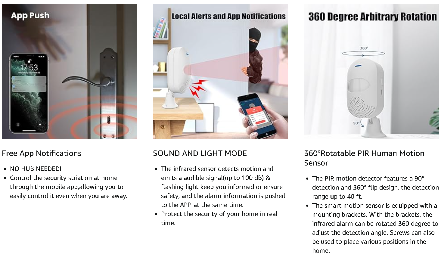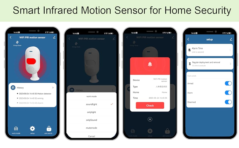 This PIR motion detector has 4 arming modes( Sound & Light Mode, Silent Mode, Matte Mode and Secret Mode). According to your daily needs, choose your favorite arming mode. The motion sensor also has a timing function, You can set the time according to your needs, DIY your home security systems.