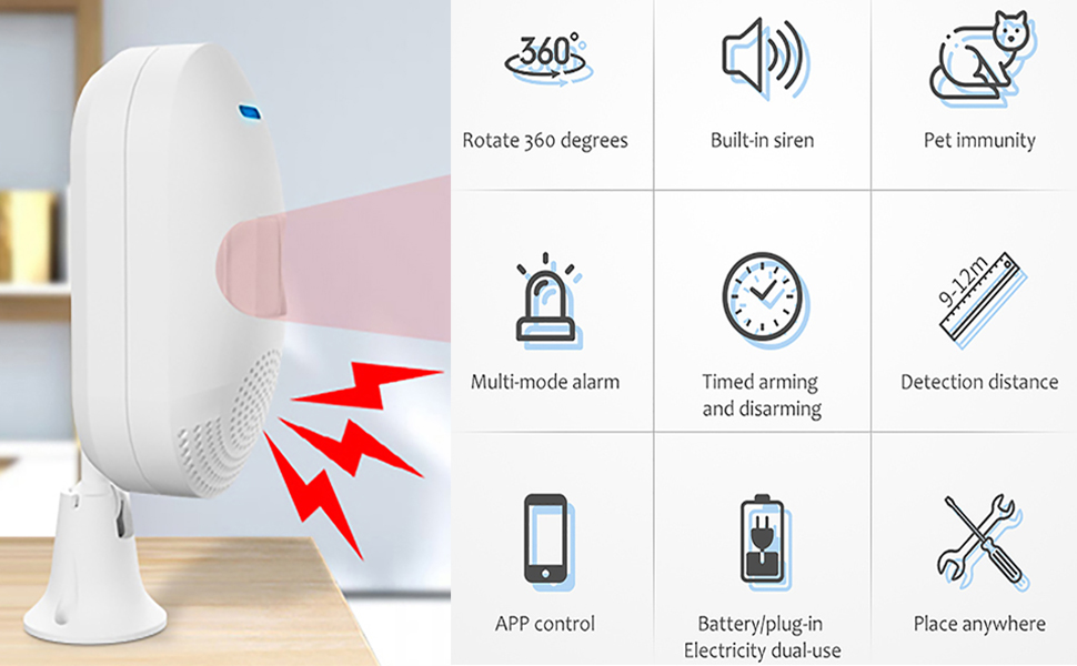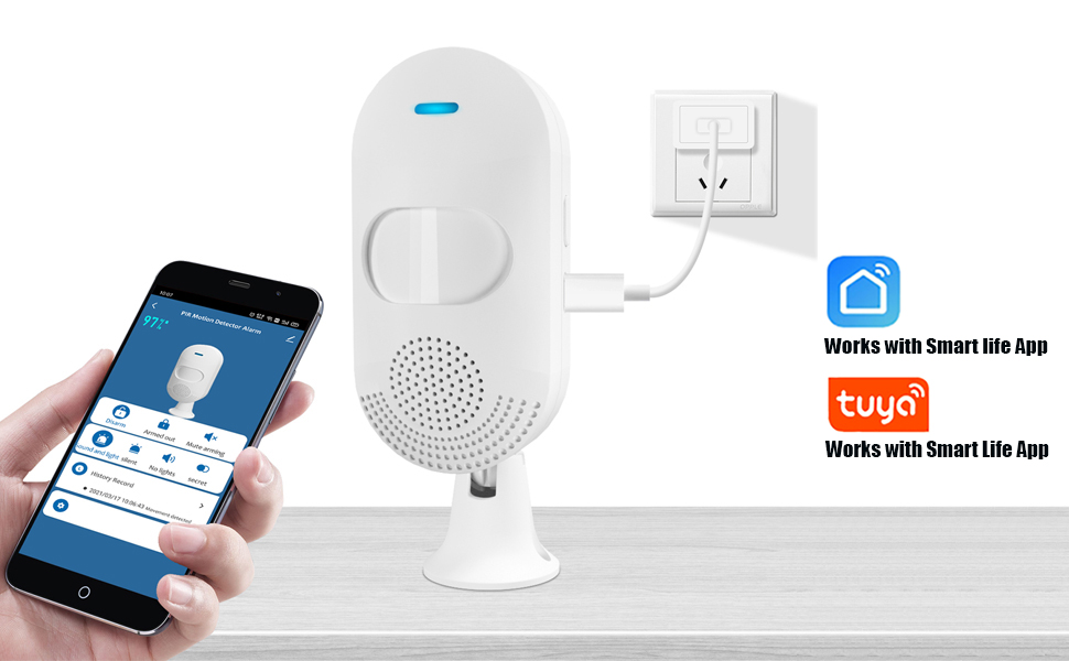 Motion detector alarm indoor can be powered by the included USB cable(included) or 2*AAA battery(NOT included). More stable to receive alert.Long-term power supply,say goodbye to power outages. It can linkage with other smart home products, such as smart lights or door sensors, etc. Setting custom scenes in your smart home system, for example, turning on the lights if motion is detected.