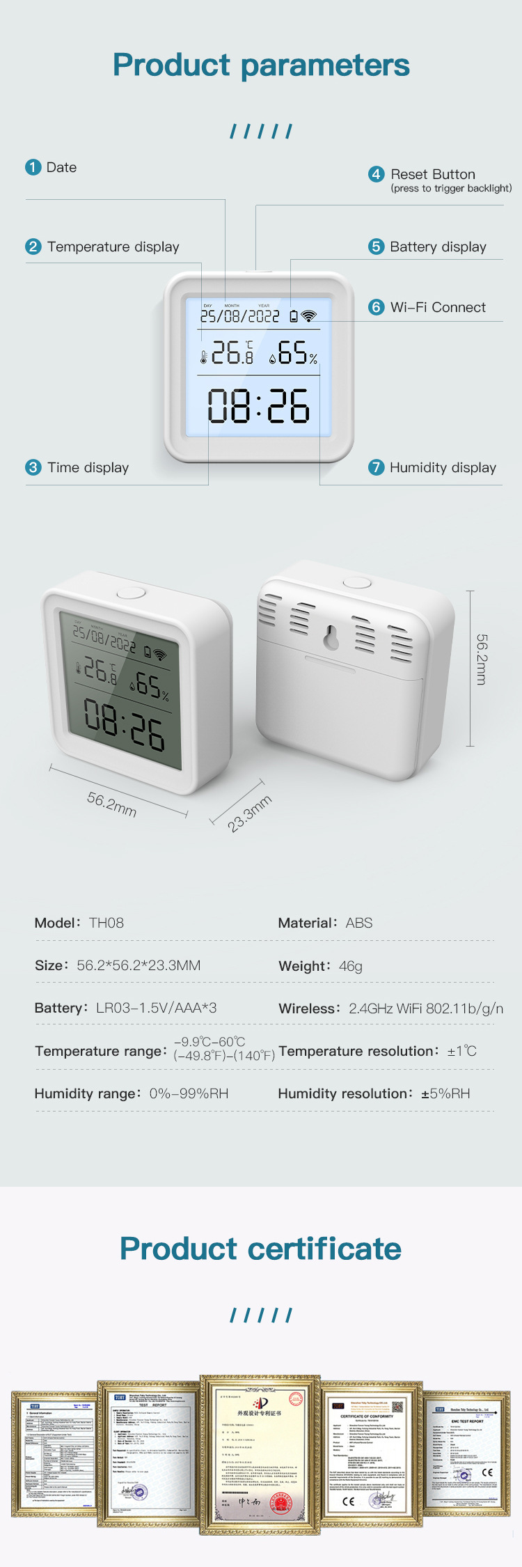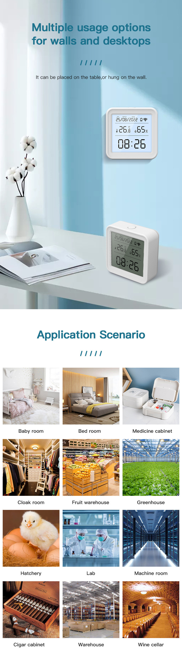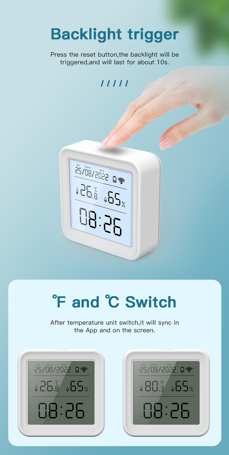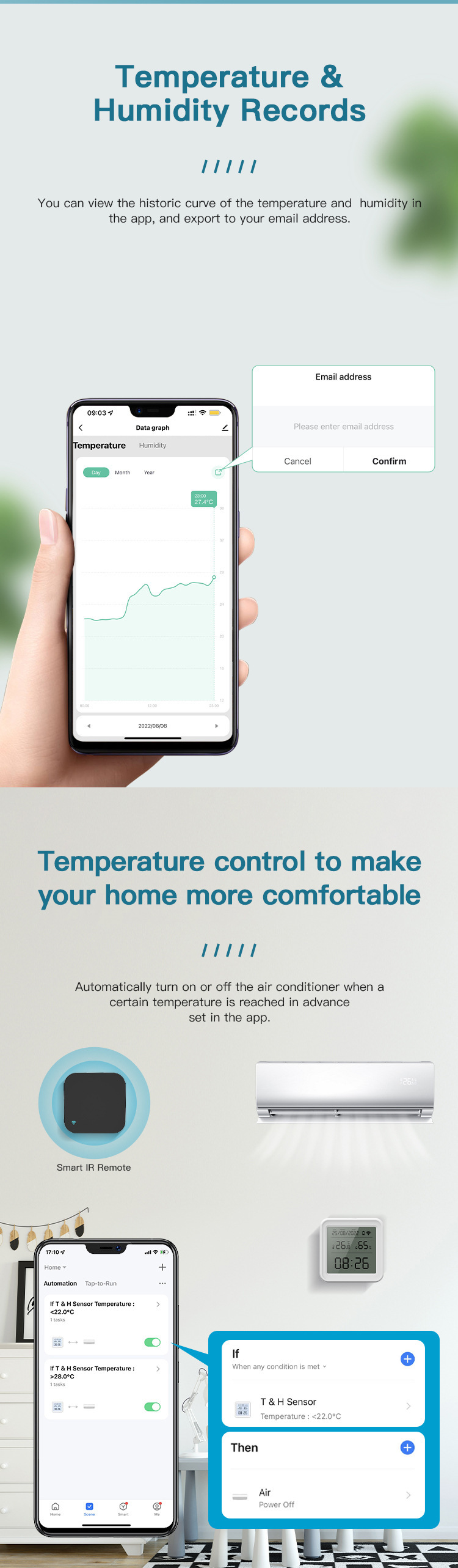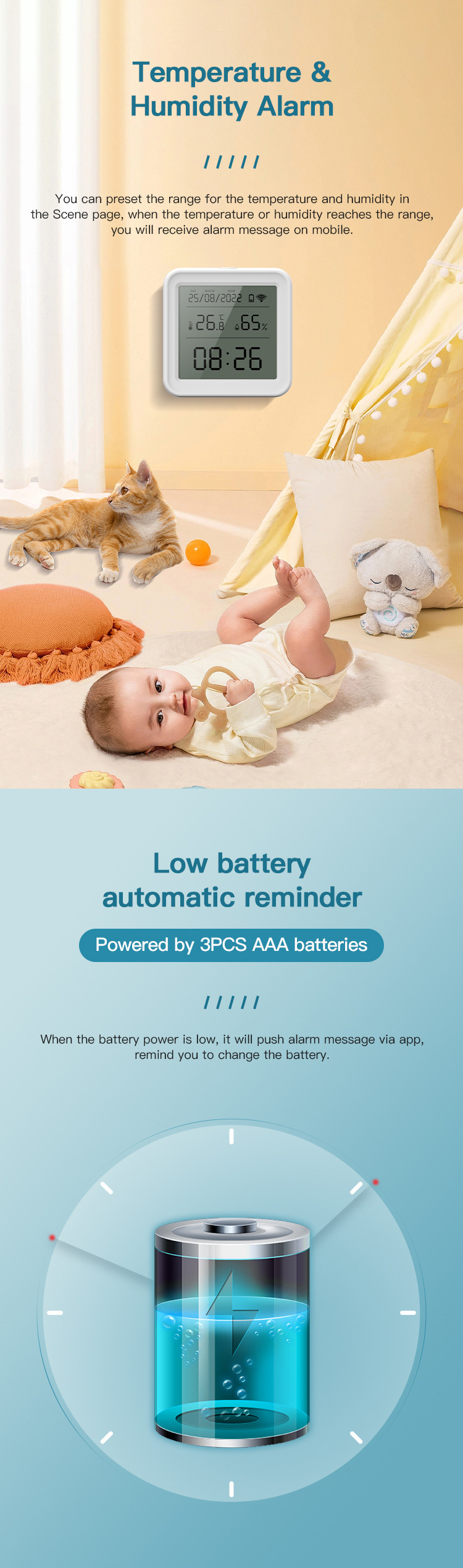 INTELLIGENT LINKAGE FUNCTION: Smart humidity sensor can perform intelligent linkage. You can set a condition in the smart scene that is the fan is turn on/off when the temperature reaches the limit value, or the dehumidifier in your room starts working once the humidity is over higher.