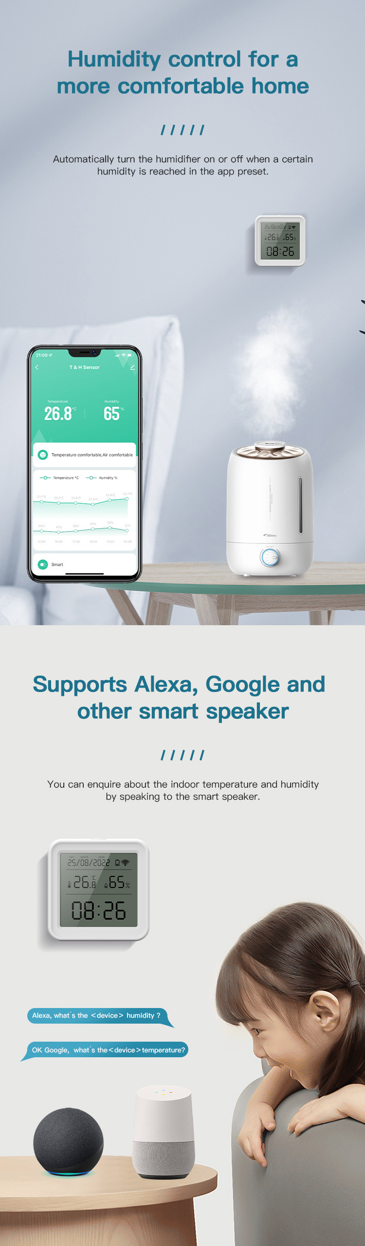 1. Because the third-party smart speakers (Google Home/Amazon Alexa) do not have control panels corresponding to temperature and humidity sensors, the temperature and humidity may not be displayed normally on the third-party smart speakers' APP. But we have opened the voice query function.
