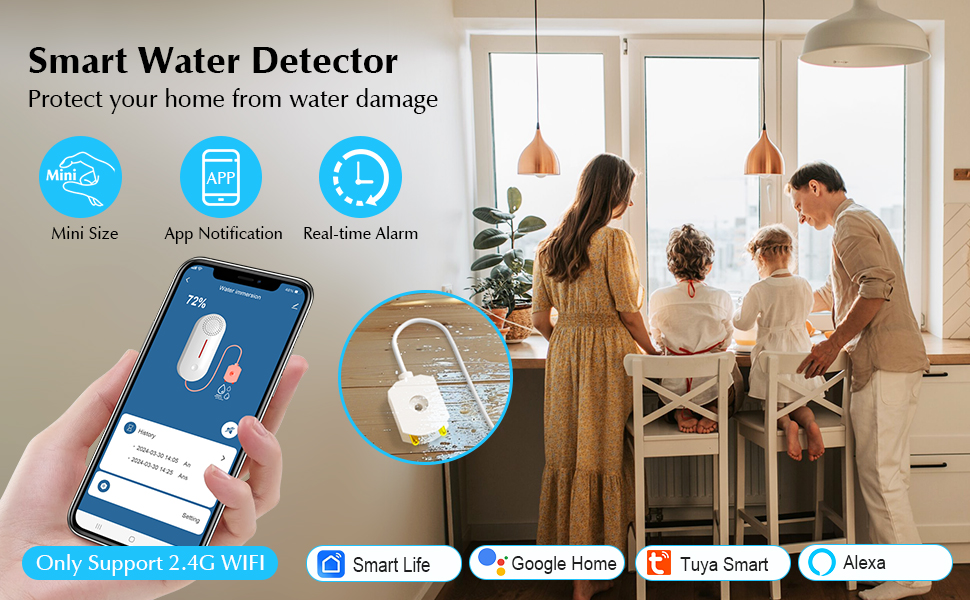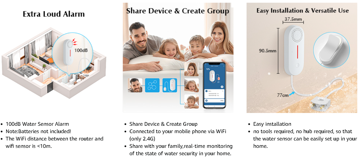 Scene Linkage ,Third-party Voice Control:Work with Alexa/ Google/Tuya App/Smart Life,set up voice commands for wifi water sensor,Alexa will answer the real-time sensors statuses.Intelligent Linkage with other devices,simply set up linkage scenarios to realise smart living.Save energy - Powered by 2 AAA batteries (not included).No wiring,no hubs required.App remote monitoring via WiFi (only 2.4G)-monitor the water safety of your home at any time