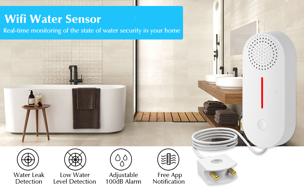 Smart Water Detector:Low Water Level , Leakage Detection , leaky faucet will sound an alarm in real time for water safety in your home.low water levels will trigger an alarm,helping to keep your home dry.Water Detector protection for home,kitchen sink,bathroom,basement