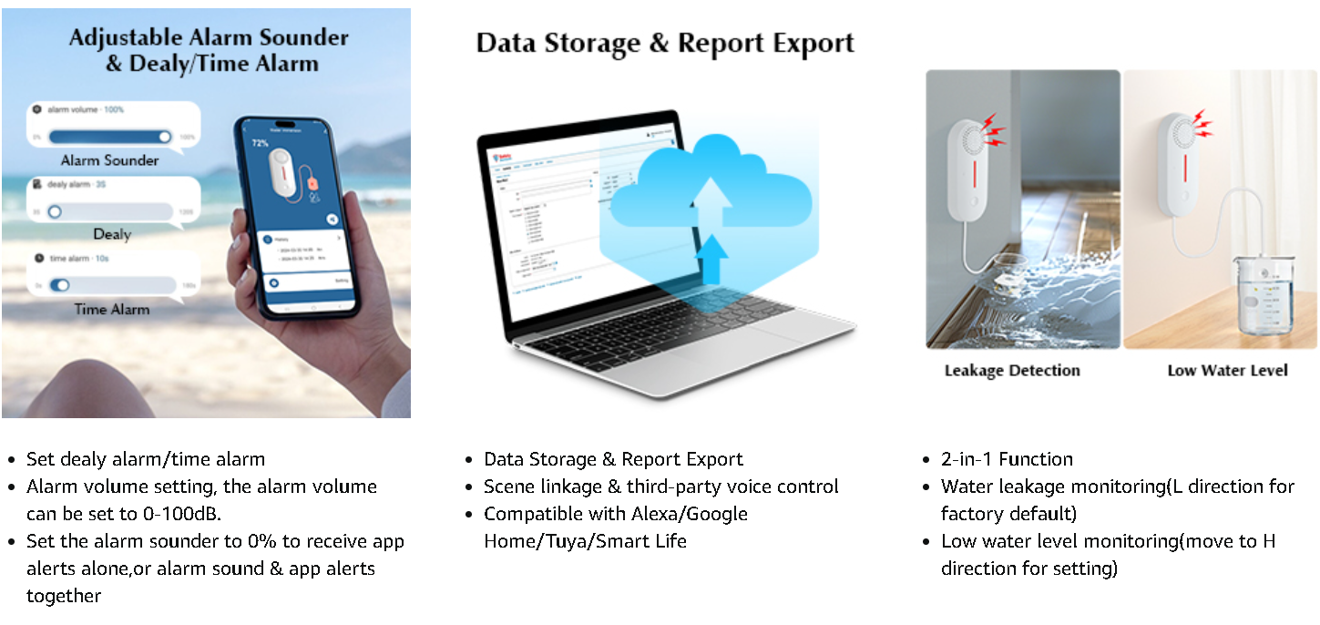Multi-functional WiFi Water Sensor:No Hub Required-just via 2.4 GHz WiFi for app remote control,adjustable 100 dB alarm sounder,free app alerts,dealy alarm/time alarm,low water level & leakage detection switch and recording history.Compatible with Alexa/ Google/Tuya App/Smart Life for scene linkage & third-party voice control.Share with your family,real-time monitoring of the state of water security in your home